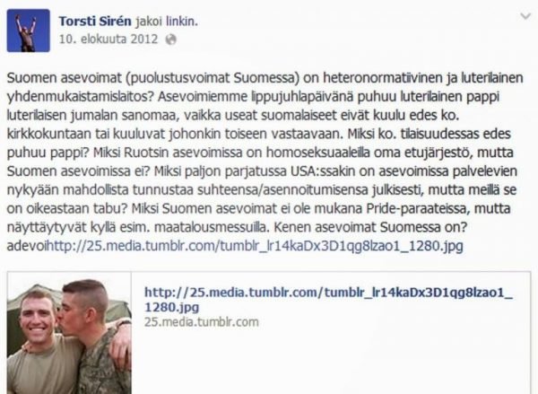 Suomen merivoimien kapteeniluutnantti, turvallisuuspäällikkö Joachim Rosenlöf, maasotakoulun majuri Paavo Kärnä ja nimikkeistökeskuksen johtaja majuri Juha Kurki tykkäävät kovasti Torsti Sirénin Pride-intoilusta.